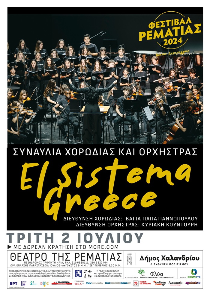 Την αυλαία ανοίγει την Τρίτη 2 Ιουλίου, η μεγάλη καλοκαιρινή συναυλία της διαπολιτισμικής ορχήστρας και χορωδίας El Sistema Greece με περισσότερα από 80 παιδιά και νέους, ηλικίας 8 έως 25 ετών που εκπροσωπούν 30 εθνικότητες, να ενώνουν τις δυνάμεις τους σε μια παγκόσμια γιορτή μουσικής στο θέατρο της Ρεματιάς.