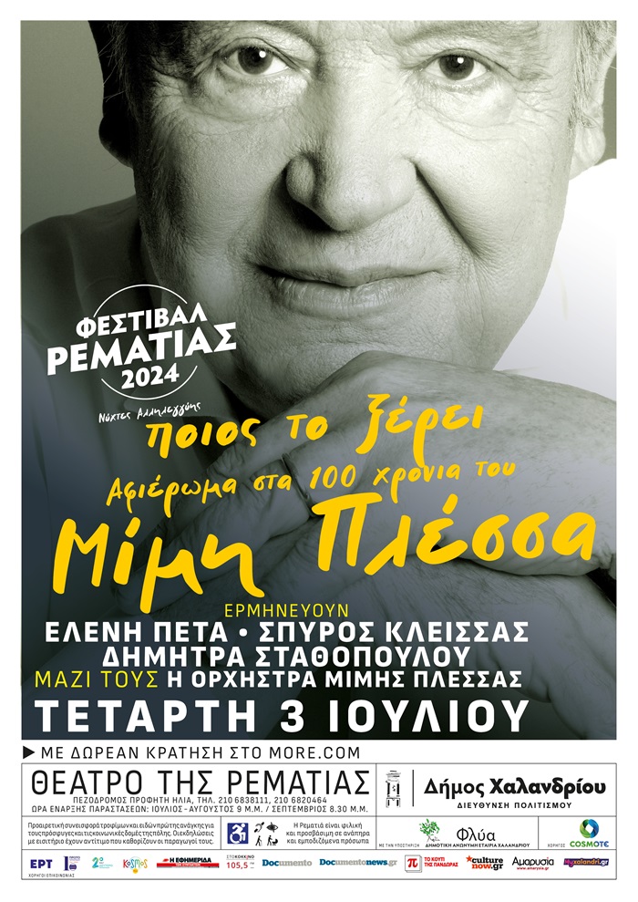 Ο άνθρωπος που έγινε συνώνυμο της μουσικής, δεν σταματάει να είναι παρόν και να δημιουργεί. Στο θέατρο Ρεματιάς, πρόκειται να παρουσιαστεί ένα πρόγραμμα με τραγούδια που είναι βαθιά χαραγμένα στη μνήμη μας, τα αγαπούν όλες οι γενιές ακροατών και έχουν συνοδεύσει ξεχωριστές στιγμές της ζωής μας. Ερμηνεύουν η Ελένη Πέτα, ο Σπύρος Κλείσσας και η Δήμητρα Σταθοπούλου. Μαζί τους η Ορχήστρα Μίμης Πλέσσας.