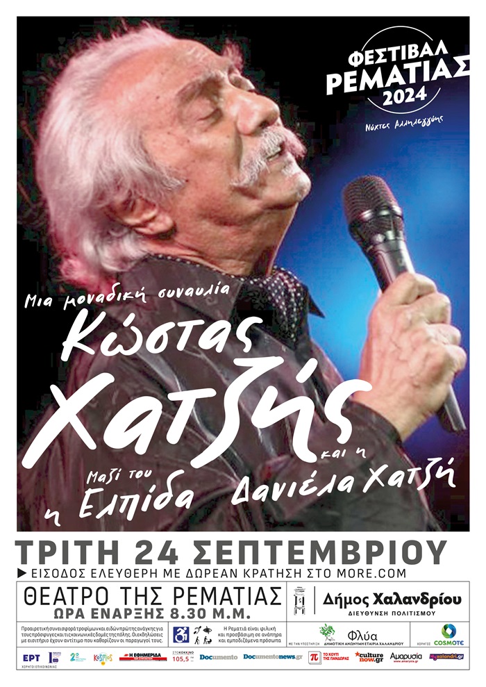 Την Τρίτη 24 Σεπτεμβρίου 2024 θα πραγματοποιηθεί η συναυλία του Κώστα Χατζή στο Θέατρο της Ρεματιάς, που είχε αρχικώς προγραμματιστεί για τις 31 Αυγούστου, αλλά αναβλήθηκε λόγω των τότε, έκτακτων καιρικών φαινομένων.
