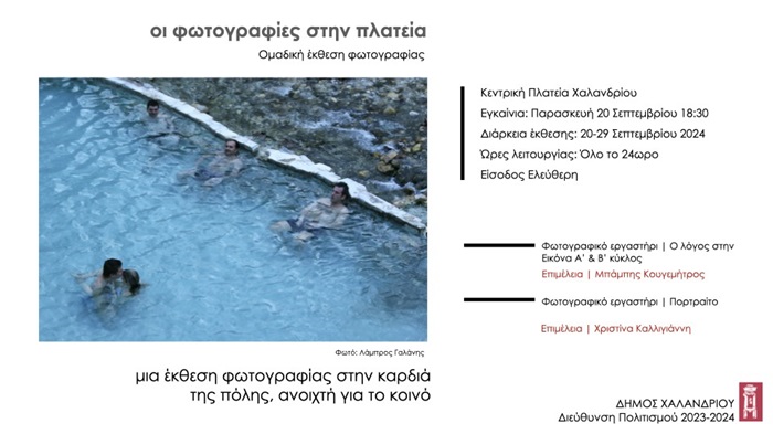 Με τη συμμετοχή 35 ερασιτεχνών φωτογράφων, κατοίκων της πόλης μας, ξεκινά την Παρασκευή 20 Σεπτεμβρίου 2024, στις 18:30 στον χώρο της παιδικής χαράς στην κεντρική πλατεία, η έκθεση «Η φωτογραφία στην πλατεία», που διοργανώνει ο Δήμος Χαλανδρίου.