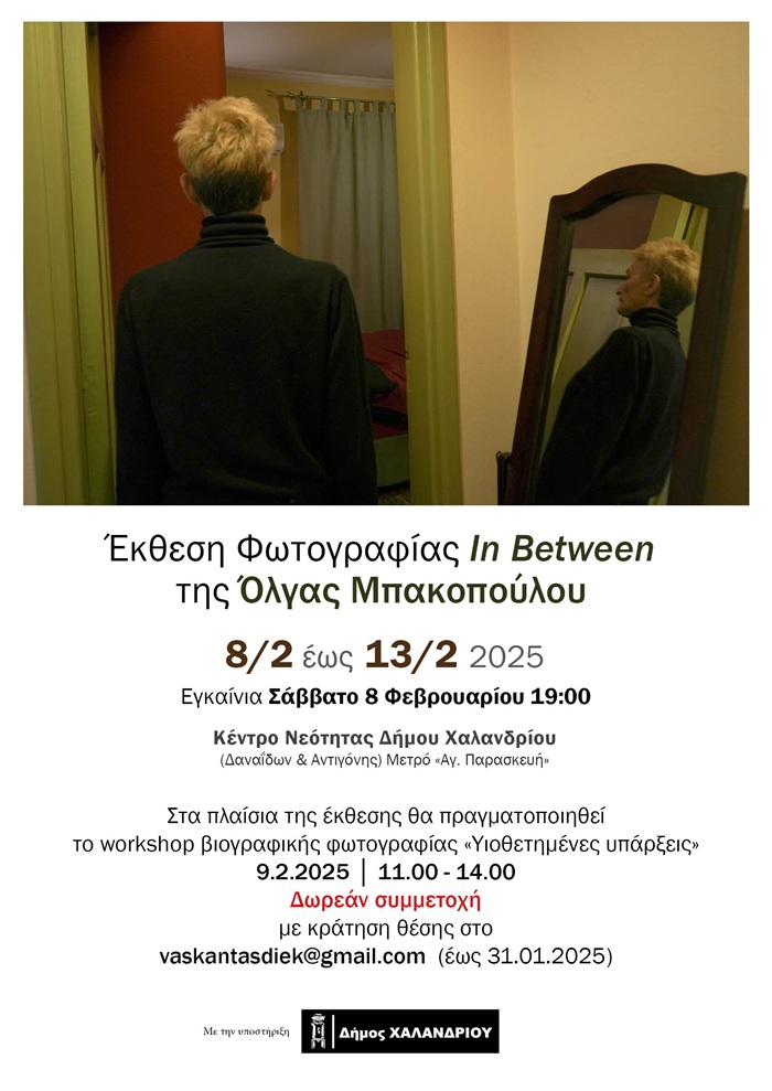 Η φωτογράφος - συγγραφέας Όλγα Μπακοπούλου παρουσιάζει, με την υποστήριξη του Δήμου Χαλανδρίου, την έκθεση «In Βetween» στο Κέντρο Νεότητας του Δήμου (Δαναΐδων & Αντιγόνης), από 8 έως 13 Φεβρουαρίου 2025. Τα εγκαίνια της έκθεσης θα πραγματοποιηθούν το Σάββατο 8 Φεβρουαρίου, στις 7:00 μ.μ., παρουσία της φωτογράφου.