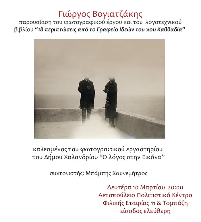 Το φωτογραφικό έργο καθώς και το λογοτεχνικό του βιβλίο που κυκλοφόρησε πρόσφατα, με τίτλο «18 περιπτώσεις από το Γραφείο Ιδεών του κου Καββαδία», το οποίο βασίζεται πάνω στη σύμπραξη λόγου και φωτογραφικής εικόνας, παρουσιάζει ο καλεσμένος του Φωτογραφικού Εργαστηρίου Δήμου Χαλανδρίου “Ο λόγος στην Εικόνα”, Γιώργος Βογιατζάκης, στο Αετοπούλειο Πολιτιστικό Κέντρο (Φιλικής Εταιρίας 11 & Τομπάζη, Χαλάνδρι), τη Δευτέρα 10 Μαρτίου 2025 και ώρα 20:00.