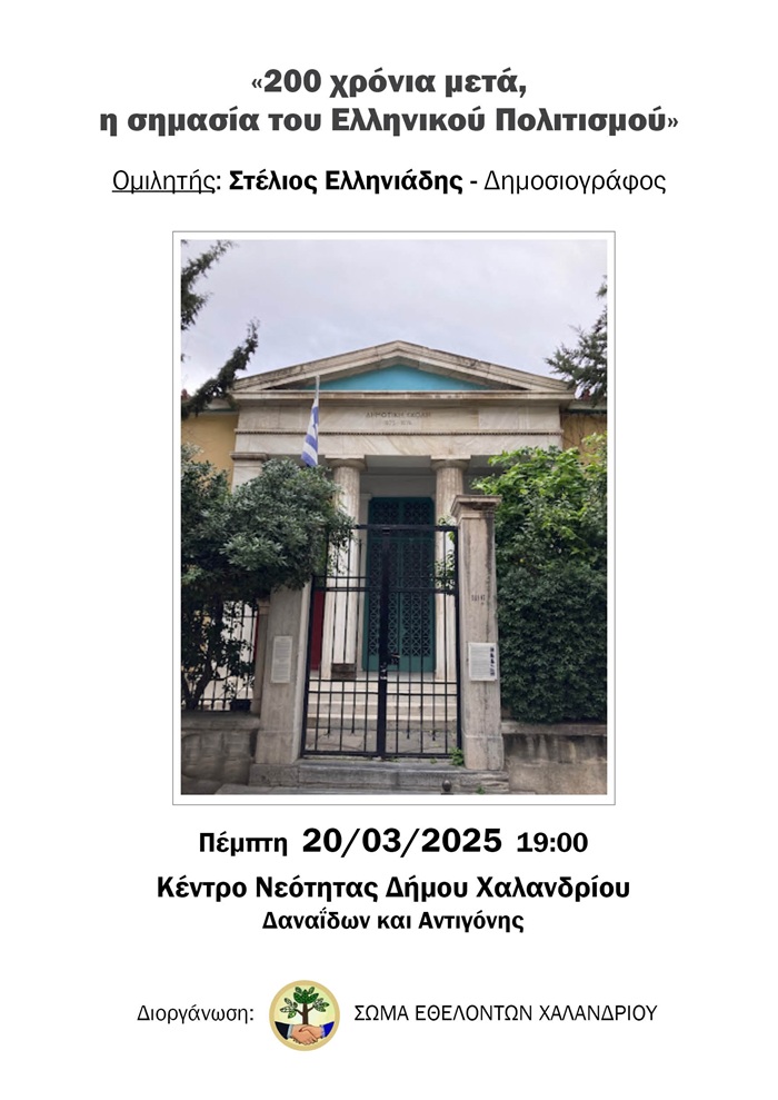 Μια πολύ σημαντική εκδήλωση διοργανώνει το Σώμα Εθελοντών Χαλανδρίου την Πέμπτη 20 Μαρτίου 2025 και ώρα 19:00, στο Κέντρο Νεότητας του Δήμου Χαλανδρίου (Δαναΐδων & Αντιγόνης). Τίτλος της εκδήλωσης: «200 χρόνια μετά, η σημασία του Ελληνικού Πολιτισμού».