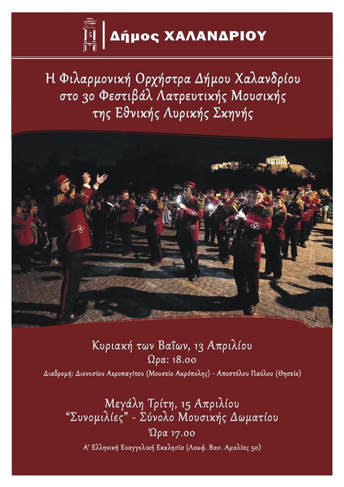 Με δυο συναυλίες συμμετέχει η Φιλαρμονική Ορχήστρα Δήμου Χαλανδρίου και φέτος, στο 3ο Φεστιβάλ Λατρευτικής Μουσικής που διοργανώνει η Εθνική Λυρική Σκηνή.