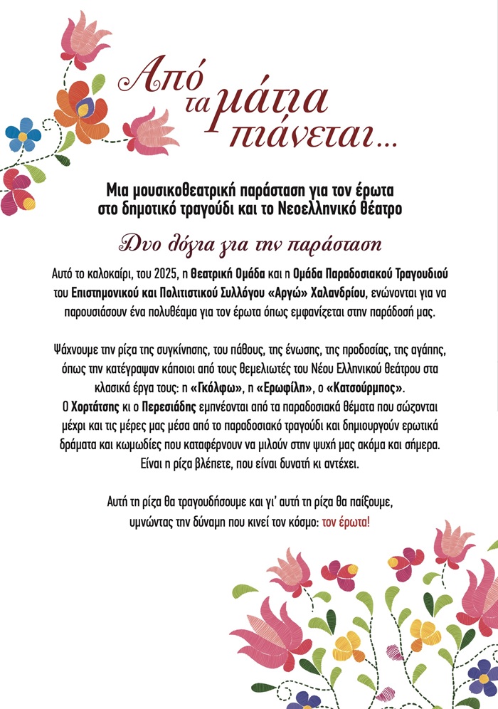 O Πολιτιστικός - Επιστημονικός Σύλλογος Χαλανδρίου ΑΡΓΩ προσκαλεί στη μουσικοθεατρική παράσταση «Από τα μάτια πιάνεται...», την Κυριακή 29 Ιουνίου 2025 και ώρα 20:30, στο Ευριπίδειο Θέατρο Ρεματιάς.