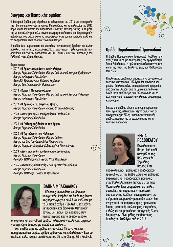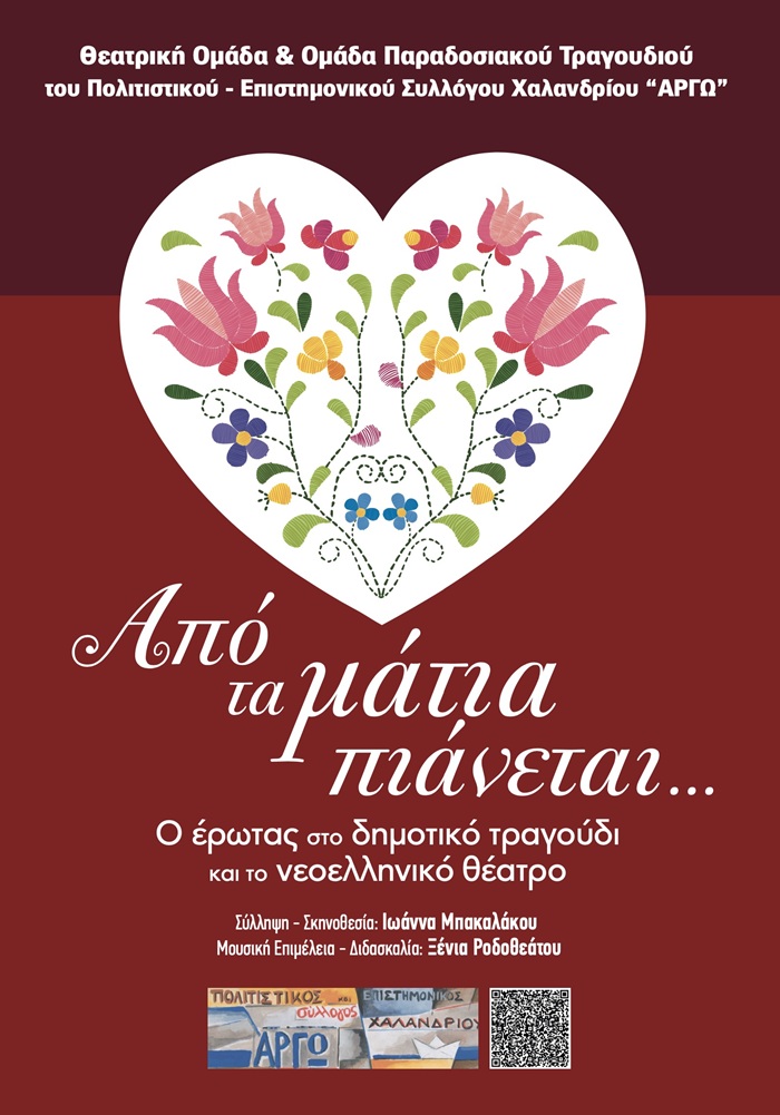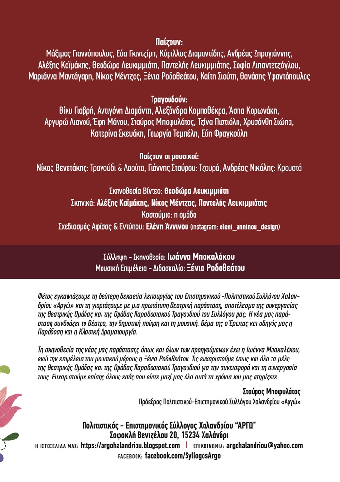 Αγαπητοί/ές μας φίλοι/ες, φέτος εγκαινιάζουμε τη 2η δεκαετία λειτουργίας του Πολιτιστικού & Επιστημονικού Συλλόγου Χαλανδρίου ΑΡΓΩ και το γιορτάζουμε με μία πρωτότυπη θεατρική παράσταση, αποτέλεσμα της συνεργασίας της Θεατρικής Ομάδας και της Ομάδας Παραδοσιακού Τραγουδιού του Συλλόγου μας.
