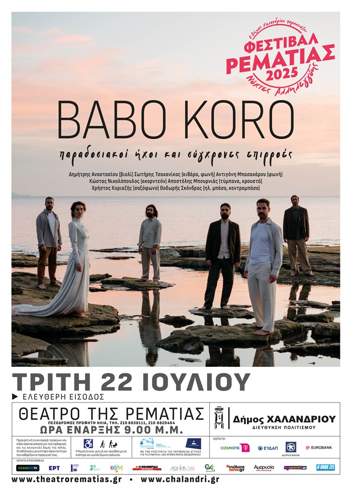 Την Τρίτη 22 Ιουλίου έρχεται μια ακόμα συναυλία. Αυτή τη φορά στη σκηνή του Θεάτρου της Ρεματιάς, ανεβαίνουν οι BABO KORO οι οποίοι παρουσιάζουν ένα συνδυασμό παραδοσιακών ήχων και σύγχρονων επιρροών, από βαλκανικές μελωδίες και την ελληνική δημοτική μουσική, μέχρι progressive rock.