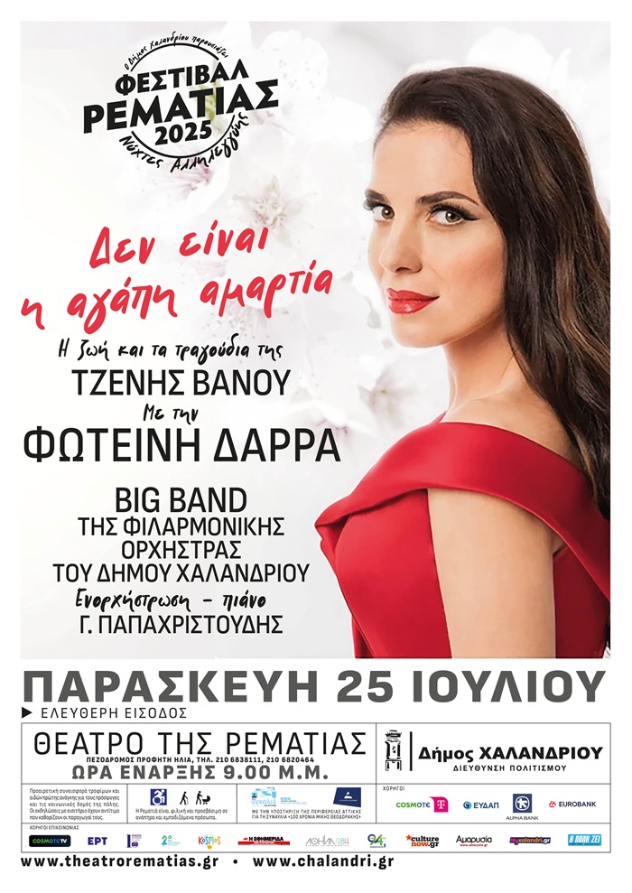 Την Παρασκευή 25 Ιουλίου, η Ρεματιά γεμίζει από τα τραγούδια της μεγάλης Τζένης Βάνου, σε μια συναυλία αφιέρωμα της Big Band της Φιλαρμονικής Ορχήστρας του Δήμου Χαλανδρίου με πρωταγωνίστρια τη Φωτεινή Δάρρα και τίτλο: «Δεν είναι η αγάπη αμαρτία».