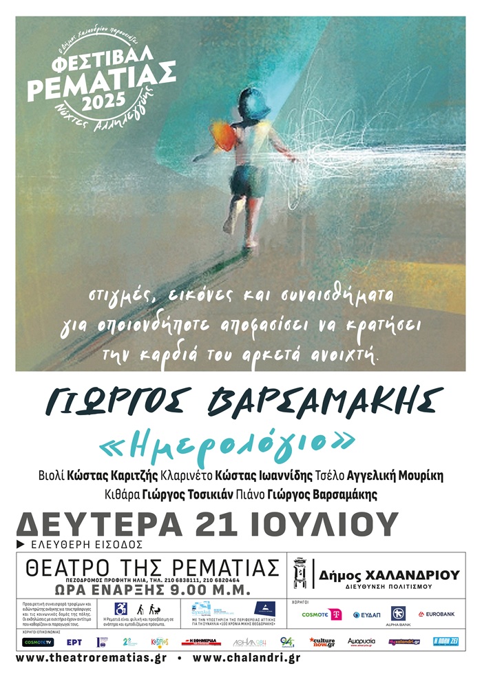 Τη Δευτέρα 21 Ιουλίου, ο τραγουδοποιός Γιώργος Βαρσαμάκης καλεί το κοινό σε μια συναυλία με τίτλο «Ημερολόγιο» όπου θα παρουσιάσει τις δημιουργίες του. Ο Γιώργος Βαρσαμάκης, κλειδώνει και περιγράφει στιγμές, εικόνες και συναισθήματα της ζωής του, που μ’ έναν τρόπο μαγικό έρχονται να συναντήσουν στιγμές, εικόνες και συναισθήματα οποιουδήποτε από εμάς αποφασίσει να κρατήσει την καρδιά του αρκετά ανοιχτή.