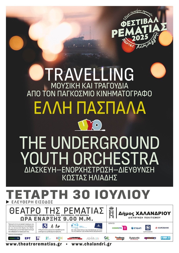 Την Τετάρτη 30 Ιουλίου, η Έλλη Πασπαλά και η The Underground Youth Orchestra μας παρουσιάζουν την παράσταση “Travelling” και μας χαρίζουν ένα συναρπαστικό ταξίδι στην κινηματογραφική μουσική. Οι διασκευές και οι ενορχηστρώσεις των έργων έχουν γίνει από τον Κώστα Ηλιάδη ο οποίος είναι και ο μαέστρος της συναυλίας. Οι λάτρεις της κινηματογραφικής μουσικής θα έχουν την ευκαιρία να απολαύσουν μουσική και τραγούδια από σημαντικές ταινίες του παγκόσμιου κινηματογράφου.