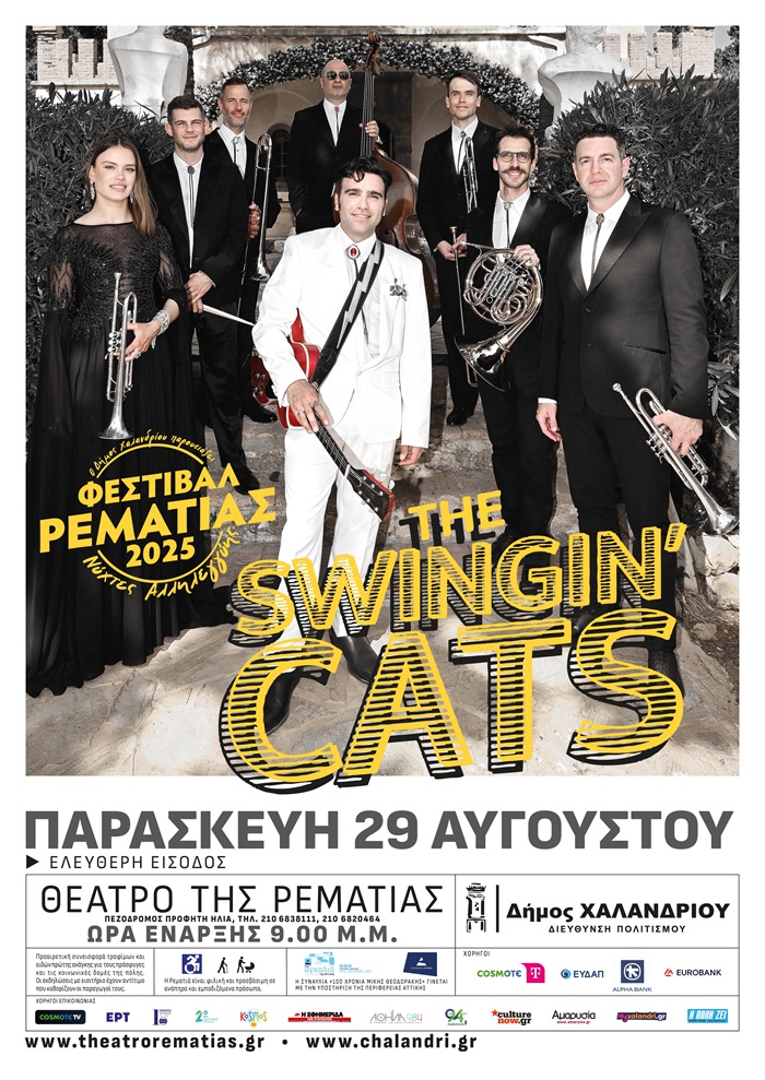 Οι Swingin’ Cats ανεβαίνουν στη σκηνή του θεάτρου Ρεματιάς Χαλανδρίου για μια εκρηκτική βραδιά γεμάτη ρυθμό, λάμψη και χορό. Ένα συναυλιακό happening που ενώνει το παλιό με το καινούργιο, το ρετρό με το σύγχρονο, και την ενέργεια της πόλης με τη μαγεία της καλοκαιρινής νύχτας στη φύση.