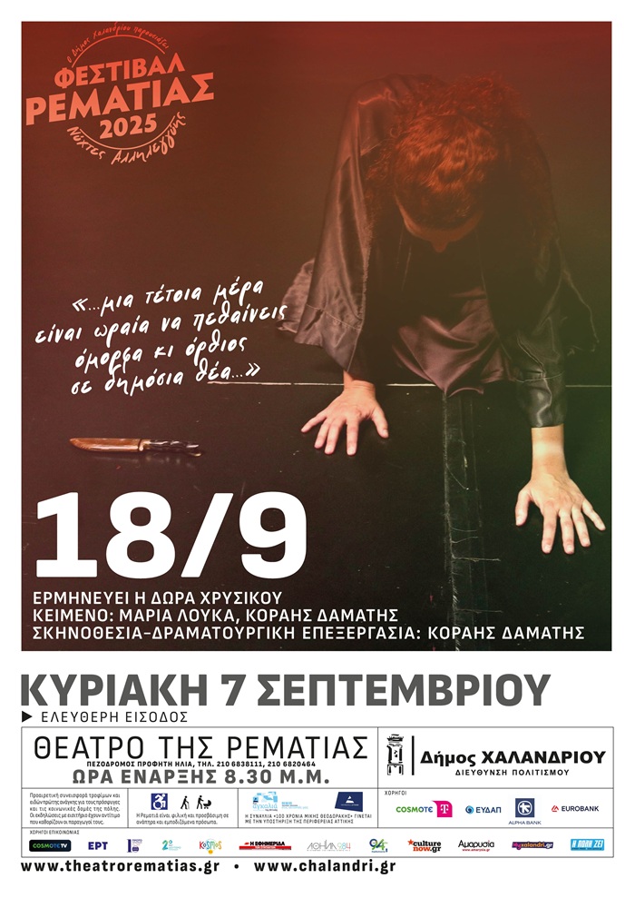 Κυριακή 7 Σεπτεμβρίου: Θεατρικός μονόλογος «18/9» με τη Δώρα Χρυσικού