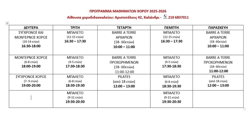 Η Διεύθυνση Πολιτισμού του Δήμου Χαλανδρίου ενημερώνει ότι από τη Δευτέρα 15 και έως τις 26 Σεπτεμβρίου 2025 το Εργαστήριο Χορού του Δήμου προσφέρει δοκιμαστικά μαθήματα, χωρίς καμία οικονομική επιβάρυνση και χωρίς υποχρέωση εγγραφής, για μια πρώτη γνωριμία με τις διαφορετικές μορφές χορού και εκγύμνασης.