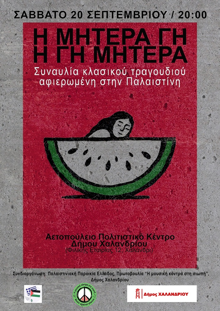 Η πρωτοβουλία «Η μουσική κόντρα στη σιωπή», σε συνεργασία με την Παλαιστινιακή Παροικία στην Ελλάδα και τον Δήμο Χαλανδρίου διοργανώνει τη συναυλία κλασσικού τραγουδιού με τίτλο «Η μητέρα γη, η γη μητέρα», αφιερωμένη στην Παλαιστίνη, το Σάββατο 20 Σεπτεμβρίου 2025 στις 20:00, στο Αετοπούλειο Πολιτιστικό Κέντρο Χαλανδρίου (Φιλικής Εταιρείας 12 & Τομπάζη).
