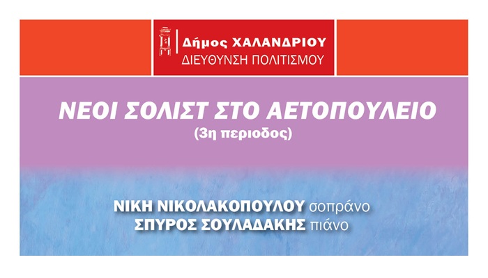 Με τη σοπράνο Νίκη Νικολακοπούλου και τον πιανίστα Σπύρο Σουλαδάκη ανοίγει ο 3ος κύκλος των συναυλιών «Νέοι σολίστ στο Αετοπούλειο», που διοργανώνουν η Συμφωνική Ορχήστρα Νέων Δήμου Χαλανδρίου και η Δημοτική Φιλαρμονική, το Σάββατο 29 Νοεμβρίου 2025, στις 19:00, στο Αετοπούλειο Πολιτιστικό Κέντρο του Δήμου Χαλανδρίου (Φιλικής Εταιρείας 12).