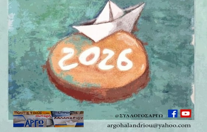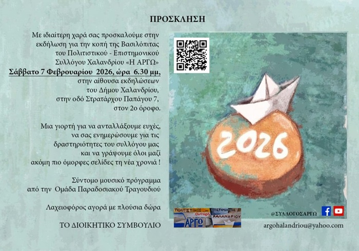 O Πολιτιστικός - Επιστημονικός Σύλλογος Χαλανδρίου ΑΡΓΩ κόβει την Πρωτοχρονιάτικη Πίτα του 2026 και σας προσκαλεί το Σάββατο 7 Φεβρουαρίου και ώρα 18:30, στην αίθουσα εκδηλώσεων του Δήμου Χαλανδρίου (Στρατάρχου Παπάγου 7, Χαλάνδρι - 2ος όροφος),
