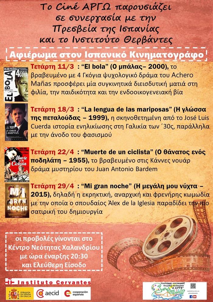 Πρόγραμμα προβολών του Αφιερώματος στον Ισπανικό Κινηματογράφο από τον Πολιτιστικό - Επιστημονικό Σύλλογο Χαλανδρίου ΑΡΓΩ: