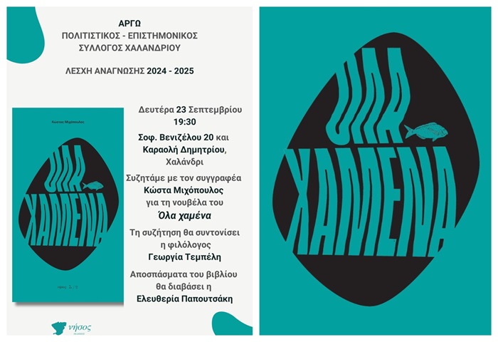 Η Λέσχη Ανάγνωσης του Πολιτιστικού - Επιστημονικού Συλλόγου Χαλανδρίου ΑΡΓΩ σας προσκαλεί σε συζήτηση με τον Κώστα Μιχόπουλο, συγγραφέα της νουβέλας