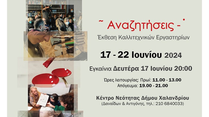 Τα 10 καλλιτεχνικά εργαστήρια του Δήμου Xαλανδρίου παρουσιάζουν το έργο τους, στην έκθεση «˜ Αναζητήσεις -˙», που εγκαινιάζεται τη Δευτέρα