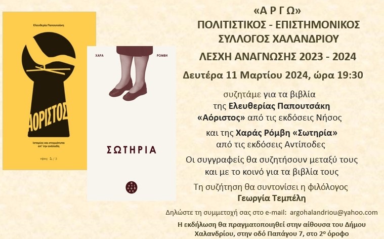 Η Λέσχη Ανάγνωσης του Πολιτιστικού - Επιστημονικού Συλλόγου Χαλανδρίου ΑΡΓΩ προσκαλεί τη Δευτέρα 11 Μαρτίου 2024 και ώρα 19:30, σε συζήτηση