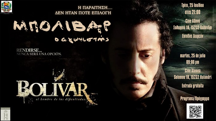 Η πρεσβεία της Μπολιβαριανής Δημοκρατίας της Βενεζουέλας στην Ελλάδα και ο Δήμος Χαλανδρίου, σε συνεργασία με τον θερινό κινηματογράφο «Cine Αθηνά», προβάλλουν την ταινία «Μπολίβαρ, ο αγωνιστής», με αφορμή τη