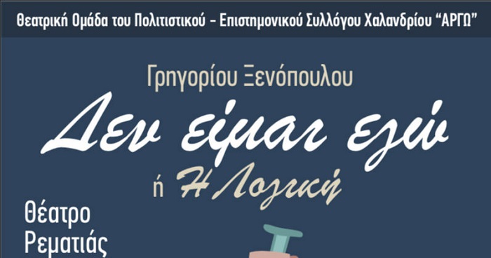 Η Θεατρική Ομάδα του Πολιτιστικού - Επιστημονικού Συλλόγου Χαλανδρίου «ΑΡΓΩ» παρουσιάζει το έργο του Γρηγορίου Ξενόπουλου «Δεν είμαι εγώ ή Η Λογική», την Τετάρτη 28 Ιουνίου 2023 και ώρα 21:00, στο