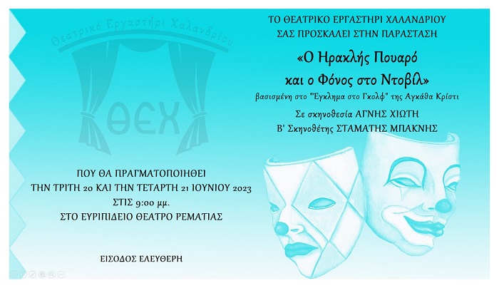 Το Θεατρικό Εργαστήρι Χαλανδρίου με ιδιαίτερη χαρά σας προσκαλεί να παρακολουθήσετε την παράσταση «Ο Ηρακλής Πουαρό και ο Φόνος στο