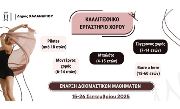 Η Διεύθυνση Πολιτισμού του Δήμου Χαλανδρίου ενημερώνει ότι από τη Δευτέρα 15 και έως τις 26 Σεπτεμβρίου 2025 το Εργαστήριο
