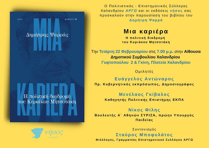 Ο Πολιτιστικός - Επιστημονικός Σύλλογος Χαλανδρίου «ΑΡΓΩ» και οι εκδόσεις νήσος προσκαλούν στην παρουσίαση του βιβλίου του Δημήτρη Ψαρρά «Μια καριέρα. Η