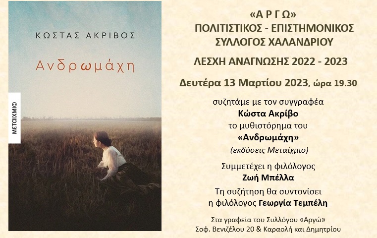 H Λέσχη Ανάγνωσης του Πολιτιστικού - Επιστημονικού Συλλόγου Χαλανδρίου «ΑΡΓΩ» προσκαλεί τη Δευτέρα 13 Μαρτίου 2023 και ώρα 19:30, στη συζήτηση για το μυθιστόρημα του Κώστα Ακρίβου «Ανδρωμάχη» (εκδόσεις Μεταίχμιο).