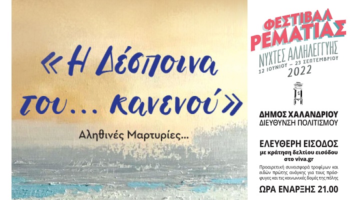 Την παράσταση, με κεντρικό θέμα τη Μικρασιατική Καταστροφή, “Δέσποινα του... κανενού”, σε σκηνοθεσία Νικολέτας Βλαβιανού από την Καλλιτεχνική Εταιρεία ART, φιλοξενεί το Φεστιβάλ Ρεματιάς 2022 - Νύχτες Αλληλεγγύης, τη Δευτέρα 1η