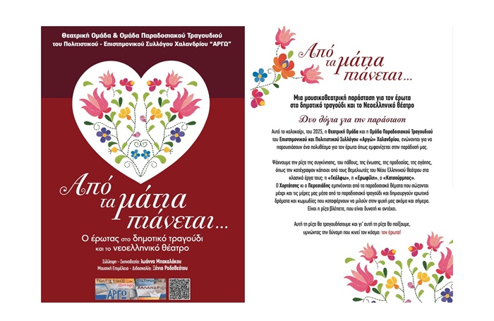 O Πολιτιστικός - Επιστημονικός Σύλλογος Χαλανδρίου ΑΡΓΩ προσκαλεί στη μουσικοθεατρική παράσταση «Από τα μάτια πιάνεται...», την Κυριακή 29 Ιουνίου 2025 και ώρα 20:30, στο Ευριπίδειο Θέατρο Ρεματιάς.