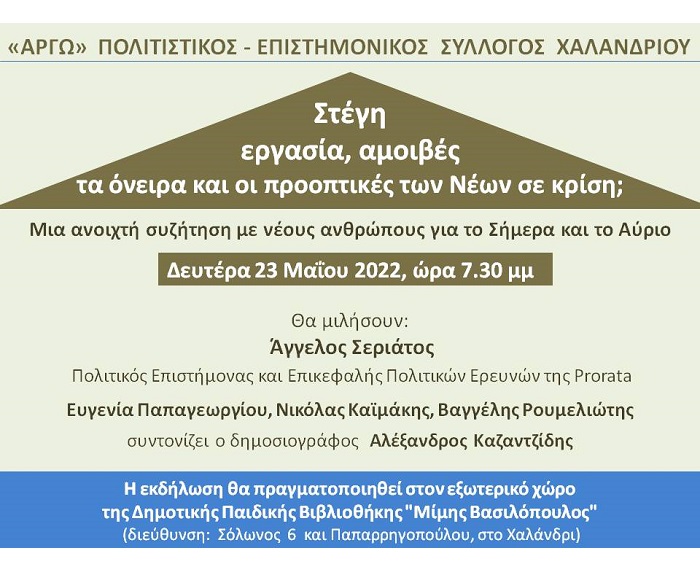 Ο Πολιτιστικός - Επιστημονικός Σύλλογος Χαλανδρίου «ΑΡΓΩ» προσκαλεί τη Δευτέρα 23 Μαΐου 2022 και ώρα 7:30 μ.μ., στην εκδήλωση με θέμα:
