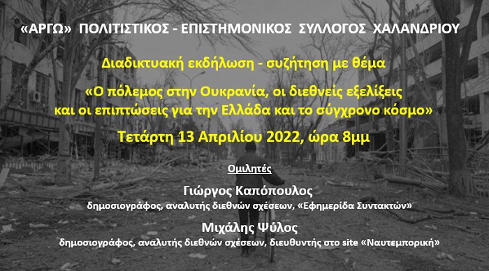 O Πολιτιστικός - Επιστημονικός Σύλλογος Χαλανδρίου «ΑΡΓΩ» διοργανώνει διαδικτυακή εκδήλωση - συζήτηση με θέμα: «Ο πόλεμος στην Ουκρανία, οι διεθνείς εξελίξεις και οι επιπτώσεις για την Ελλάδα και τον σύγχρονο κόσμο», την