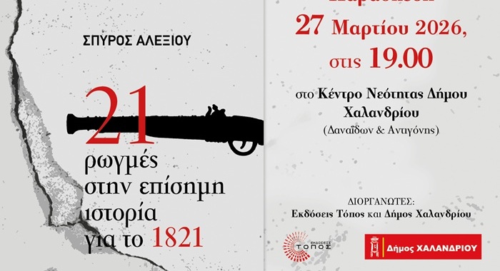Ο Δήμος Χαλανδρίου και οι εκδόσεις «Τόπος» διοργανώνουν, με αφορμή την επέτειο της 25ης Μαρτίου, την εκδήλωση «21 Ρωγμές στην