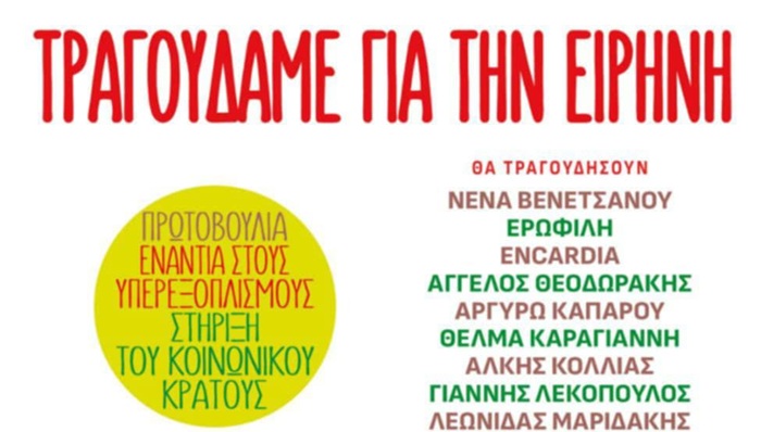 Με σύνθημα «Τραγουδάμε για την Ειρήνη», η «Πρωτοβουλία Ενάντια στους Υπερεξοπλισμούς, στήριξη του Κοινωνικού Κράτους» διοργανώνει μια μεγάλη Μουσική Συναυλία