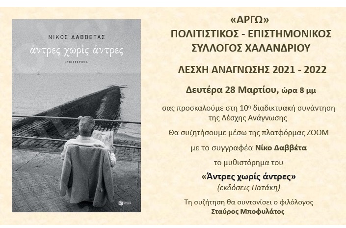 Ο Πολιτιστικός - Επιστημονικός Σύλλογος Χαλανδρίου «ΑΡΓΩ» προσκαλεί στη 10η διαδικτυακή συνάντηση της Λέσχης Ανάγνωσης (μέσω ΖΟΟΜ), τη Δευτέρα 28 Μαρτίου
