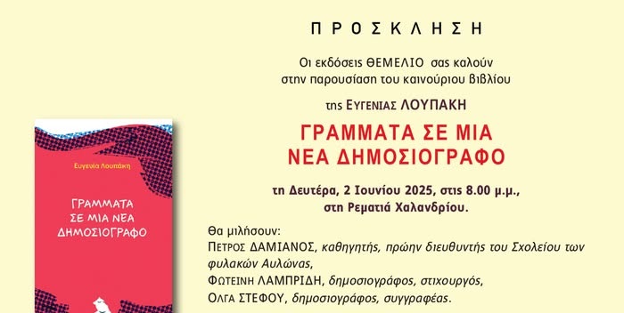 Οι εκδόσεις Θεμέλιο παρουσιάζουν το καινούριο βιβλίο της Ευγενίας Λουπάκη «ΓΡΑΜΜΑΤΑ ΣΕ ΜΙΑ ΝΕΑ ΔΗΜΟΣΙΟΓΡΑΦΟ», τη Δευτέρα 2 Ιουνίου 2025,