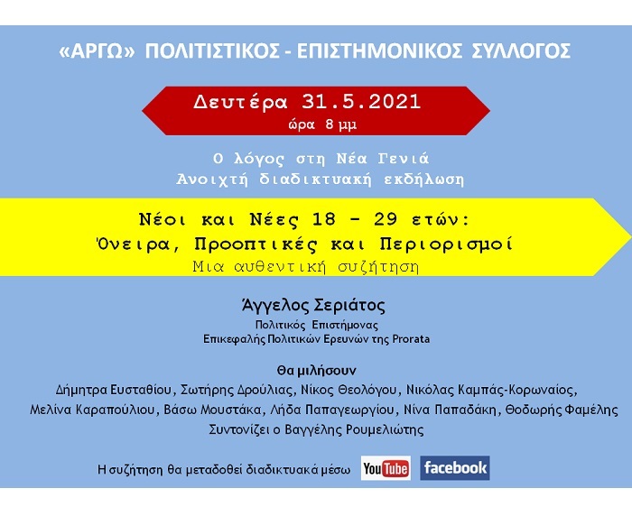 Ο Πολιτιστικός - Επιστημονικός Σύλλογος Χαλανδρίου ΑΡΓΩ διοργανώνει ανοιχτή διαδικτυακή εκδήλωση, τη Δευτέρα 31 Μαΐου 2021 και ώρα 8:00 μ.μ., με