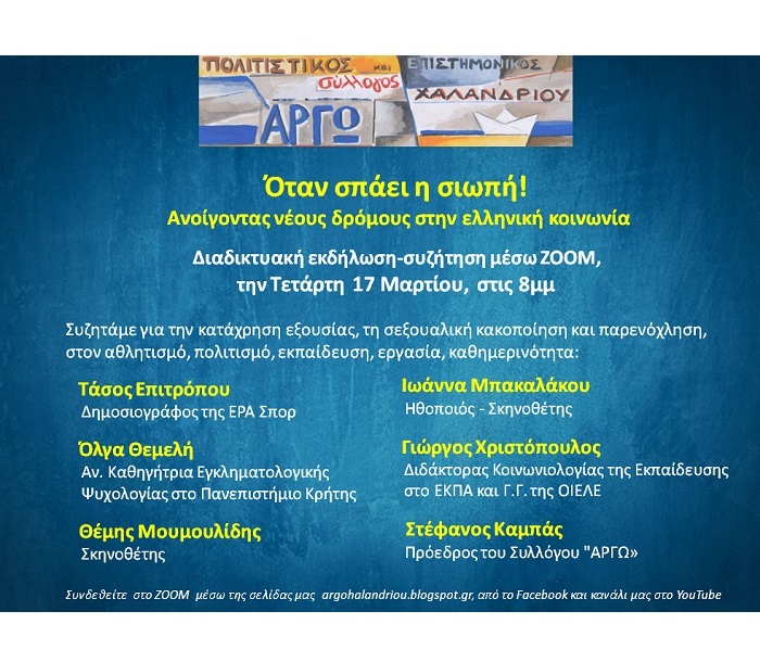 Ο Πολιτιστικός - Επιστημονικός Σύλλογος Χαλανδρίου «ΑΡΓΩ» διοργανώνει ανοιχτή διαδικτυακή εκδήλωση - συζήτηση με θέμα “Όταν σπάει η σιωπή! - Aνοίγοντας νέους δρόμους στην ελληνική κοινωνία”, την Τετάρτη 17 Μαρτίου 2021, στις 8:00