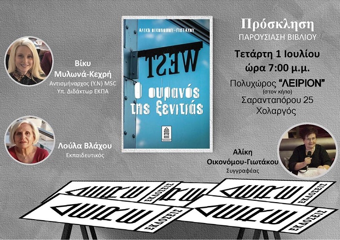Οι εκδόσεις ΔΕΡΕ και η συγγραφέας Αλίκη Οικονόμου-Γιωτάκου σας προσκαλούν την Τετάρτη 1η Ιουλίου 2020 και ώρα 19:00, στον φιλόξενο κήπο του πολυχώρου “ΛΕΙΡΙΟΝ” (Σαρανταπόρου 25, Χολαργός), στην πρώτη παρουσίαση
