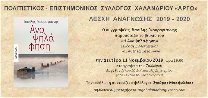 Στη Λέσχη Ανάγνωσης του Πολιτιστικού - Επιστημονικού Συλλόγου ΑΡΓΩ, τη Δευτέρα 11 Νοεμβρίου 2019 και ώρα 19:00, θα πραγματοποιηθεί συζήτηση με τον συγγραφέα Βασίλη Γκουρογιάννη για το βιβλίο του "Η Αναψηλάφηση"